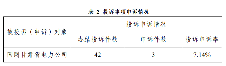 2025年10月,甘肃能源监管办接收申诉事项3件,甘肃能源企业办结投诉42件,投诉申诉率7.14%,全部为国网甘肃省电力公司。